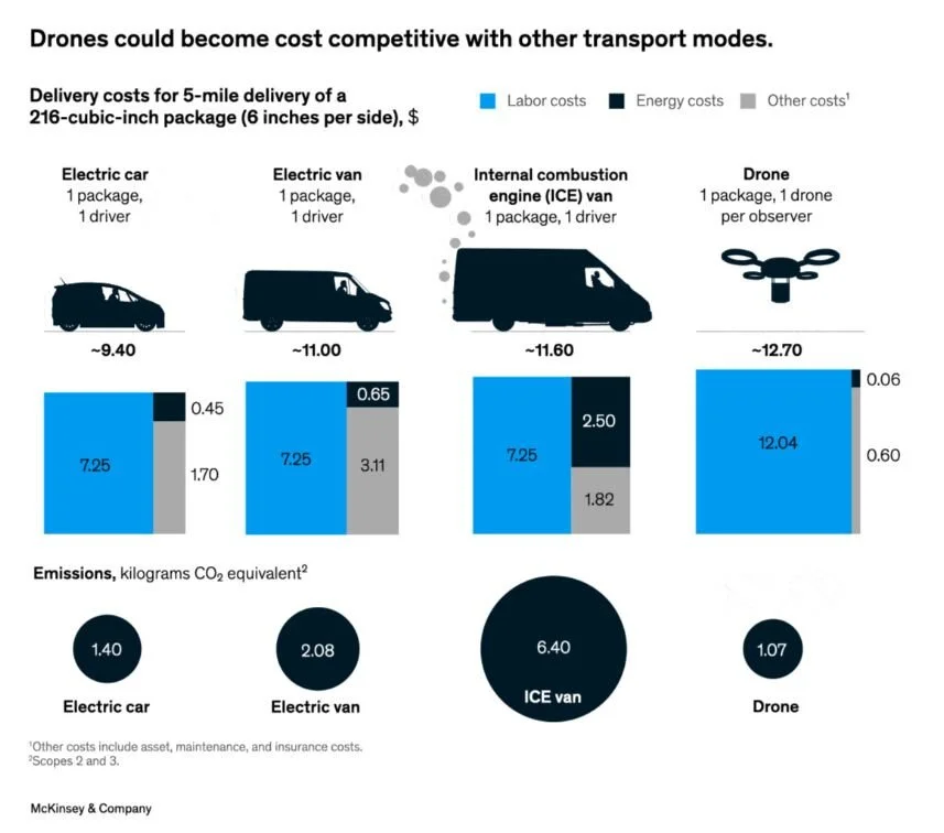 McKinsey finds that in some regions, where pooling deliveries isn’t practical, drones are already considered the most cost-effective delivery mode. Drone technology may be particularly suitable for various last-mile consumer use cases, such as convenience products, prepared foods, and medical samples for labs. | McKinsey & Company