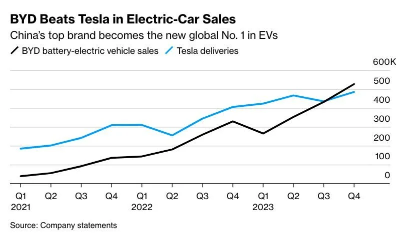 Tesla delivered more vehicles than expected in the fourth quarter, though not enough for the company to stay ahead of China’s BYD in global electric-car sales. | Bloomberg ($)