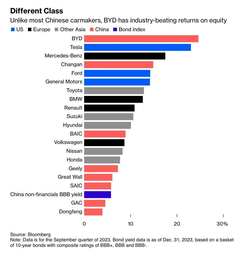 BYD has the best return on equity among major automakers worldwide. By owning its own battery supply chain and focusing on cheaper, less zippy cells that use abundant iron and phosphate instead of scarce cobalt and nickel, it’s managed to lift margins even as material costs rose. Return on invested capital, a metric that encompasses how successful the company is at generating profits from its asset base, is also the best among volume automakers worldwide and has risen consistently for the past 18 months to overtake Tesla. | Bloomberg ($)