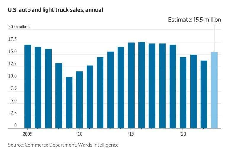 The U.S. auto industry rebounded in 2023 with many automakers reporting double-digit sales gains. Industrywide sales of new cars in the U.S. reached 15.5 million vehicles in 2023, a 12.4% increase from the prior year. | The Wall Street Journal ($)