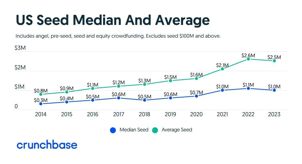 From Crunchbase: Median and average seed round sizes in the U.S. have climbed through the past decade. In 2023, median and average raises are not far from the peak of 2022, and were well above pre-pandemic. | Crunchbase