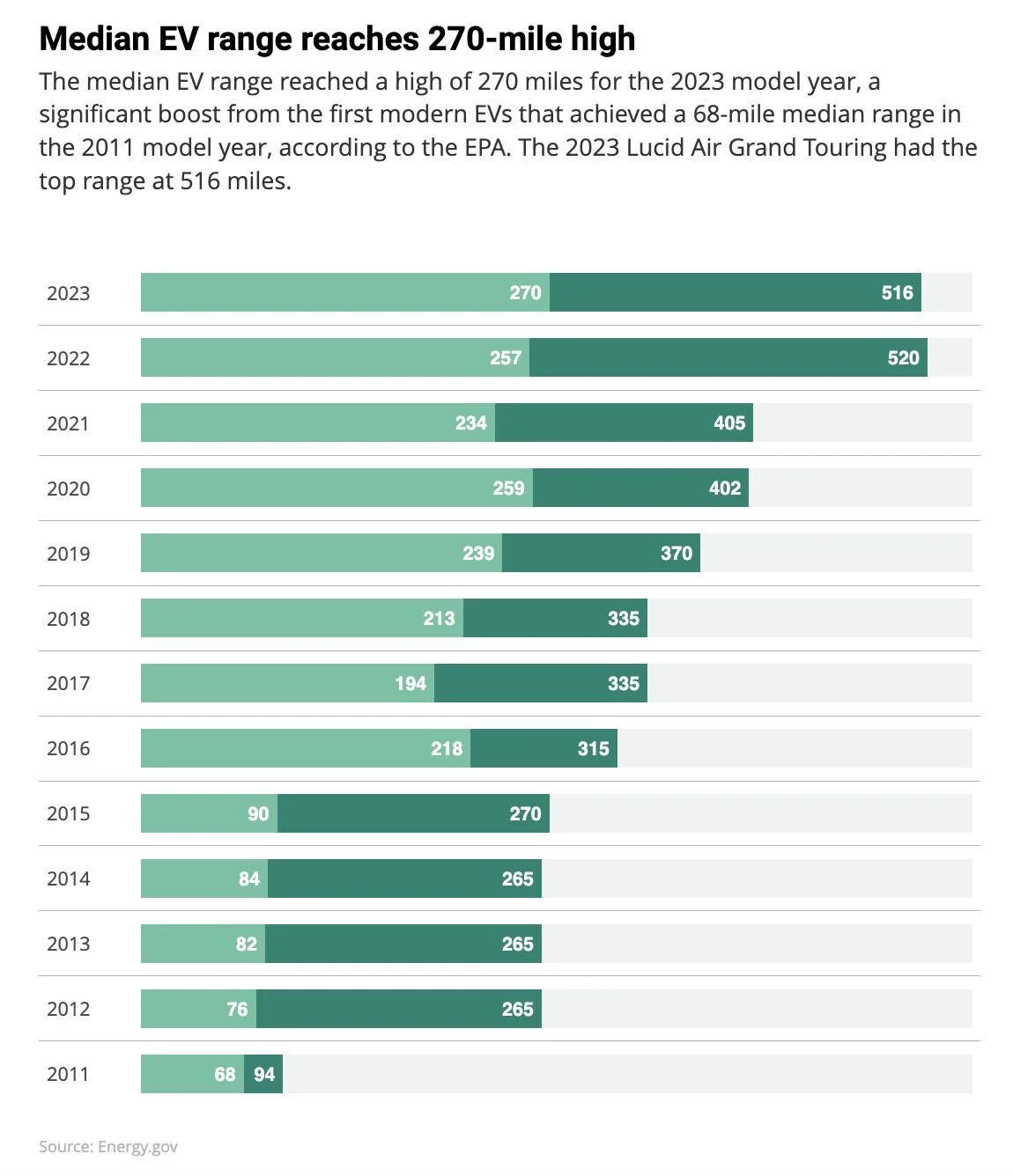 The median range for an electric vehicle grew to 270 miles for the 2023 model year, a nearly 200-mile climb from the 82 miles of 2013, according to the EPA. The median increased 13 miles from the 2022 model year. The average driver in the U.S. covers 37 miles per day, according to the U.S. DOT. That means a full charge of 270 miles would enable more than a week of commuting for the average driver. | Automotive News ($)