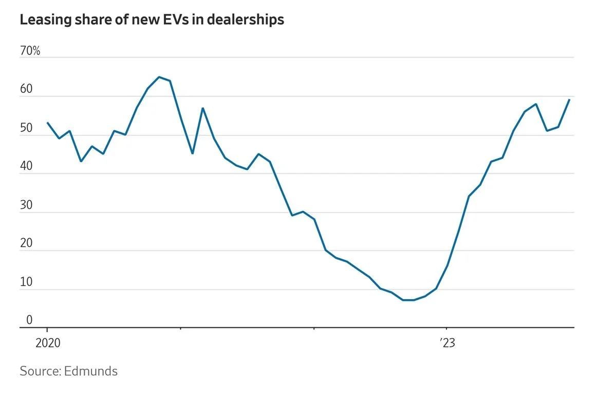 59% of the EVs sold through U.S. dealerships in December were leased rather than bought outright — this calculation excludes the market leader Tesla, whose leasing share fell to 2% of deliveries in the fourth quarter. Tesla, which doesn’t have a banking arm like the traditional automakers, might intentionally be offering uncompetitive leasing terms so it doesn’t have to shoulder the residual-value risk within its core business. Tesla’s customers are the ones exposed to falling residual values instead. | The Wall Street Journal ($)