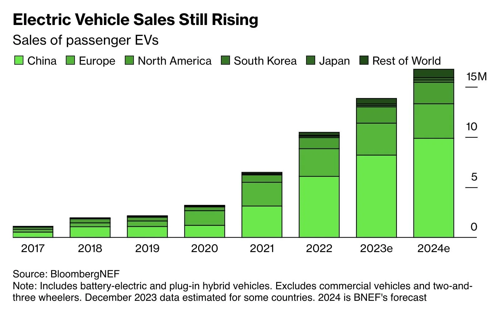 BloombergNEF expects global passenger EV sales (battery-electrics and plug-in hybrids) to increase 21% in 2024 to 16.7 million, with 70% of those being fully electric. EV sales in China should come in just under 10 million, representing almost six of every ten EVs sold globally. Still, the growth rate in China is slowing due to market saturation in the wealthier regions and tougher economic conditions overall. EV sales in the US should be just under 1.9 million, accounting for 13% of new-car purchases, but there could be some surprises to the downside as the political polarization ramps up this year. The EV share of global vehicle sales should come in around 20% (pure-electric: 14%), up from about 17% in 2023. In China, BloombergNEF expects the EV share to reach 38% of sales. | Bloomberg ($)