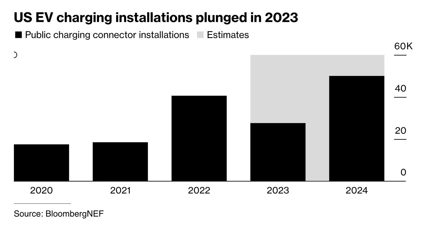 US electric vehicle charging installations fell significantly last year as companies grappled with financial challenges, according to a BloombergNEF report. US public charging installations were 76% below BNEF’s forecast in 2023 and they are expected to lag behind China and Europe this year, the report said. | Bloomberg ($)