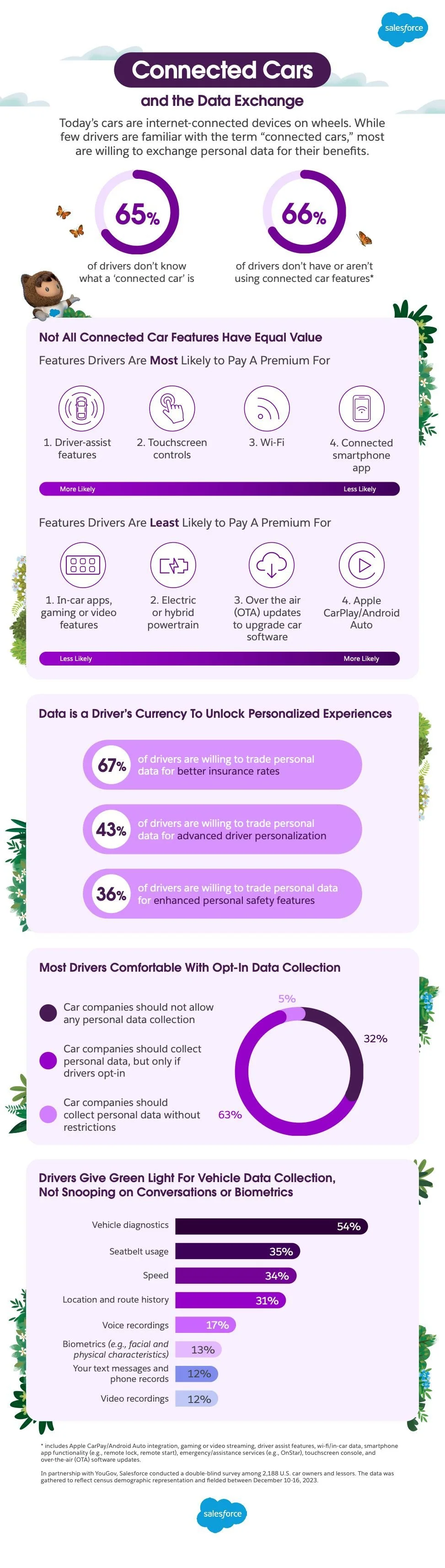 A Salesforce survey of over 2,000 car owners and lessors in the United States found that while drivers are generally willing to trade personal data for connected car benefits — like advanced personalization and cheaper insurance — few drivers actually understand what a ‘connected car’ is and what data is actually being collected. | Salesforce